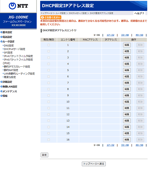 ※ 画面の[1~16][17~32][33~48][49~50]をクリックすると[DHCP固定IPアドレスエントリ]の[1~16][17~32][33~48][49~50]を切り替えて表示します。