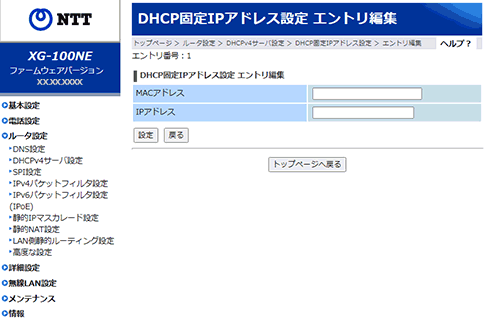 「DHCP固定IPアドレス設定」の画面が表示されます。