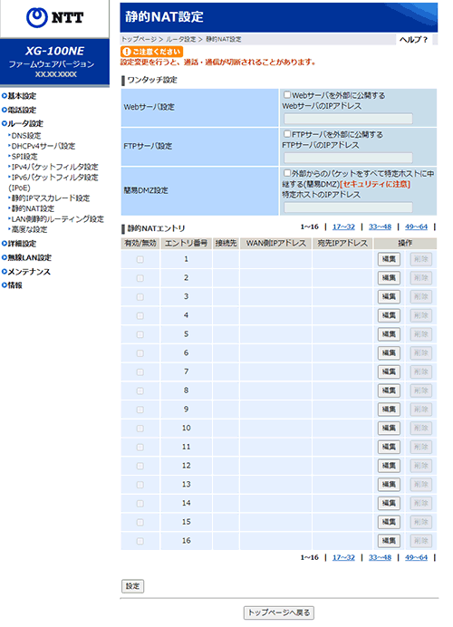 ※ 画面の[1~16][17~32][33~48][49~64]をクリックすると[静的NATエントリ]の[1~16][17~32][33~48][49~64]を切り替えて表示します。