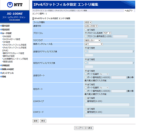 [IPv4パケットフィルタ設定 エントリ編集]