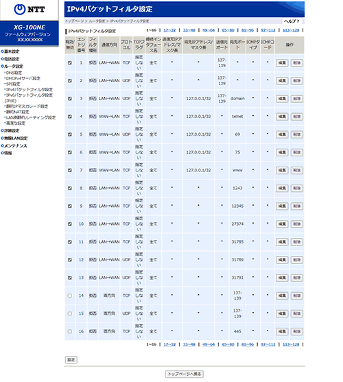 ※ 画面の[1~16][17~32][33~48][49~64][65~80][81~96][97~112][113~128]をクリックすると[IPv4パケットフィルタ設定]の[1~16][17~32][33~48][49~64][65~80][81~96][97~112][113~128]を切り替えて表示します。