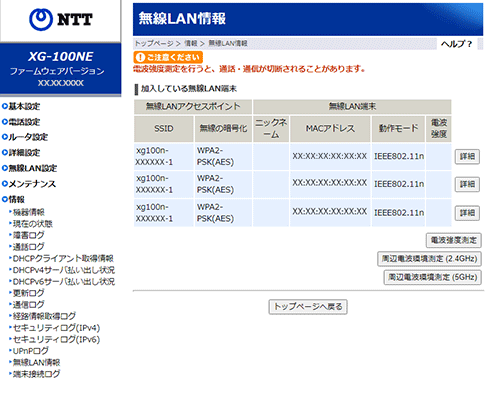 - 周辺電波環境測定を実行中は、一時的に無線LAN接続が切断されます。