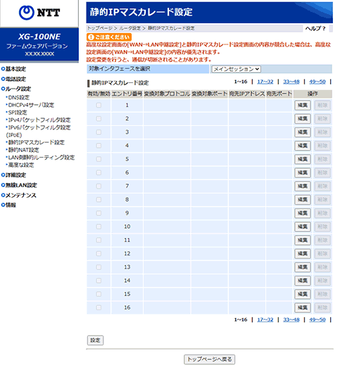 ※ 画面の[1~16][17~32][33~48][49~50]をクリックすると[静的IPマスカレード設定]の[1~16][17~32][33~48][49~50]を切り替えて表示します。