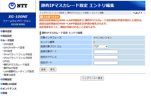 「高度な設定」の[WAN→LAN中継設定]と「静的IPマスカレード設定」の内容が競合した場合は、「高度な設定」の[WAN→LAN中継設定]の内容が優先されます。