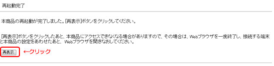 - 完了すると再起動完了のダイアログが表示されます。ひかり電話ランプが緑点灯していることを確認し、「再表示」をクリックすると、トップページが表示されます。
