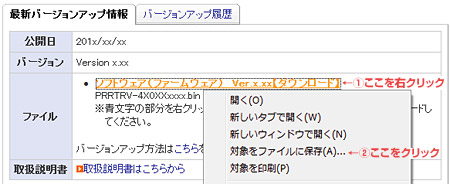 ※リンクの部分を右クリックし、「対象をファイルに保存」を選択してダウンロードしてください。 バージョンアップ方法はこちらをご覧ください。 |