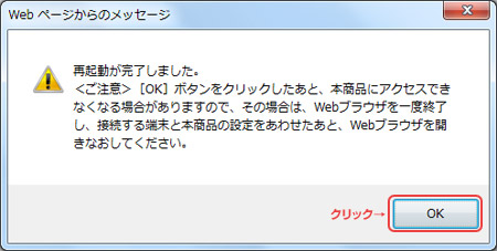 - 完了すると再起動完了のダイアログが表示されます。ひかり電話ランプが緑点灯していることを確認し、「OK」をクリックすると、トップページが表示されます。