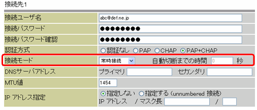 接続先1の接続モード:常時接続