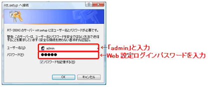 - [ntt.setupに接続]が表示されます。[ユーザー名]に「admin」と入力し、[パスワード]に初期設定時に設定したWeb設定ログインパスワードを入力し、[OK]をクリックします。