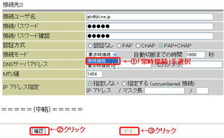 - [PPPoE設定]画面の設定変更を行う接続先の「接続モード」欄で「常時接続」を選択し、「確認」、「送信」ボタンの順にクリックします。(例;接続先3の設定を変更する場合)