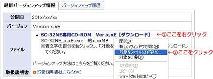 - このページの上部にある「ダウンロードファイル」にて、「SC-32NE専用CD-ROM」の部分を右クリックし、「対象をファイルに保存」を選択します。