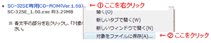 - 本ページ上部のダウンロードファイルから「SC-32SE専用CD-ROM」の部分を右クリックし、「対象をファイルに保存」を選択します。