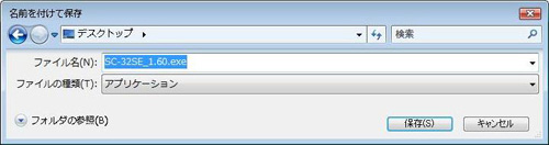 - 「名前を付けて保存」の画面が表示されますので、「SC-32SE_1.60.exe」を保存する場所を指定し、[保存]ボタンをクリックします。