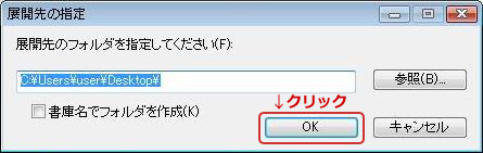 - 指定した場所に保存した「SC-32SE_1.60.exe」をダブルクリックすると、解凍先のフォルダを指定する画面が表示されますので、[OK]ボタンをクリックします。(解凍先を変更する場合は手入力するか、[参照]ボタンをクリックします。)