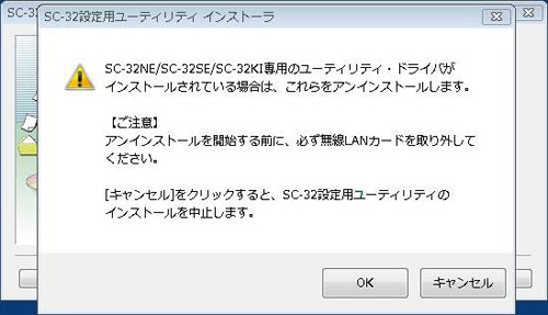 - SC-32SE専用ユーティリティ、ドライバがインストールされている場合は、必ずアンインストールしてから、SC-32設定用ユーティリティをインストールして下さい。この場合以前設定された内容は保存されませんので、必要に応じて再度設定してください。
