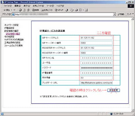 - ファームウェア更新後も、設定値が保存されるように設計されておりますが、念のため後で再設定できるように、ID、パスワード等の設定内容をメモしてからバージョンアップを行ってください。また、バージョンアップ終了後にVoIPアダプタが自動的に再起動しますのでバージョンアップ中の通話は行わないでください。