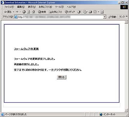 - Web設定画面を閉じずに引き続いてファームウェア更新ページにアクセスします。画面の指示に従い、バージョンアップを完了させてください。