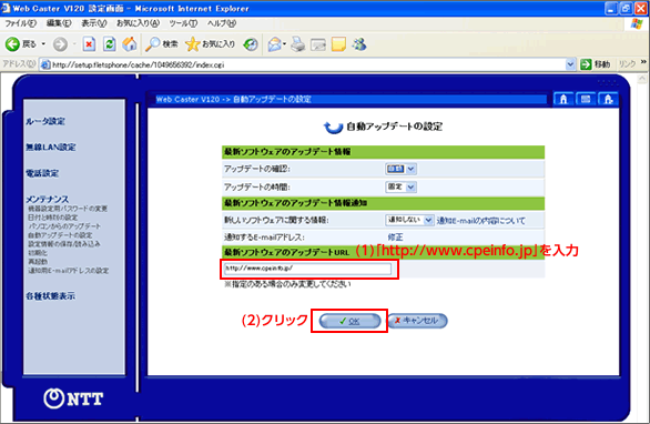 「最新ソフトウェアのアップデートURL」に「http://www.cpeinfo.jp/」を入力し、「OK」をクリック