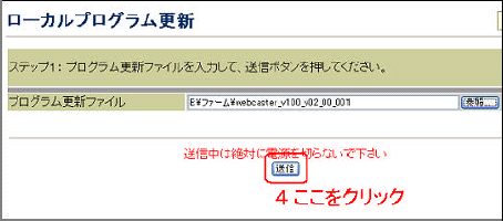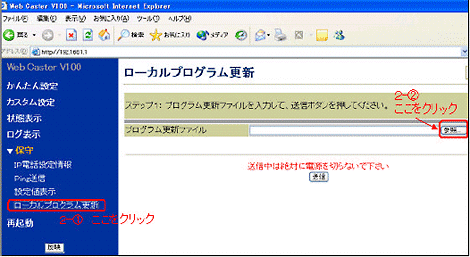 - 設定画面のメニュー[保守]から[ローカルプログラム更新]を選択し、「プログラム更新ファイル」で[参照]をクリックします。