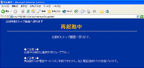 - バージョンアップ完了後は、以下の画面が表示された後、自動的に再起動しますので再起動が終了するまでお待ちください。再起動が完了すると前面のランプが一瞬全て点灯します。