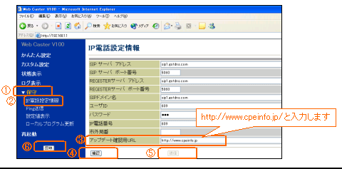 - IP電話設定情報の中の「アップデート確認用URL」に「http://www.cpeinfo.jp/」を入力