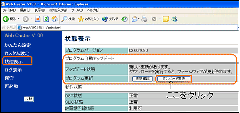 『新しい更新があります。』と表示されているとき、ファームウェア更新情報があります。『ダウンロード実行』をクリックすれば、最新ファームウェアへのバージョンアップが開始されます。