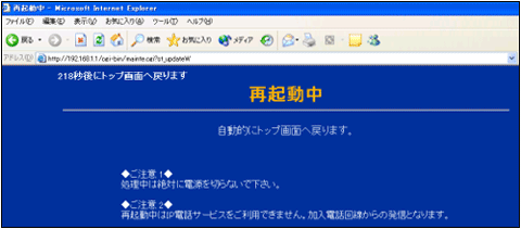 回復不能な故障の原因となります。 - ファームウェアのバージョンアップ中は、IP電話をご利用いただけません。IP電話通話中の場合は、通話を終了してから、ファームウェアのバージョンアップを行ってください。