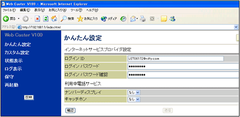 アドレス欄に「http://192.168.1.1/」を入力してください。(WebCasterV100のアドレスを変更している場合は、変更したアドレスを入力してください) - 設定画面左側のメニューから、以下の手順で設定します。