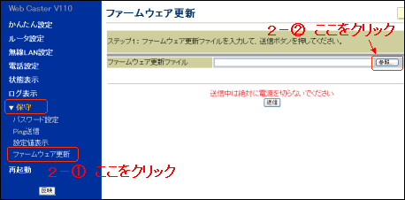 - 設定画面のメニュー[保守]から[ファームウェア更新]を選択し、「ファームウェア更新ファイル」で[参照]をクリックします。