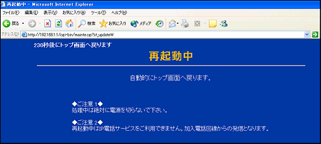 - バージョンアップ開始後、「かんたん設定」のページが表示されるまで絶対に装置本体の電源を落とさないでください。途中で電源を落としますと装置本体のソフトウェア(ファームウェア)が破壊され、復旧不可能な状態となる場合がございます。