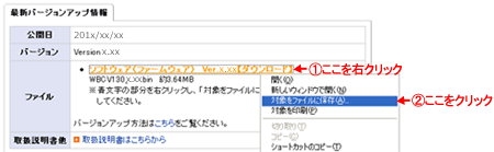 ※リンクの部分を右クリックし、「対象をファイルに保存」を選択してダウンロードしてください。 バージョンアップ方法はこちらをご覧ください。 |