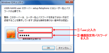 [ユーザー名]に『user』と入力し、[パスワード]に初期設定時に設定した機器設定用パスワードを入力し、「OK」をクリックします。