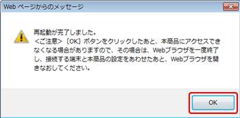- 完了すると、再起動完了のダイアログが表示されます。IP電話ランプが緑点灯していることを確認し、「OK」をクリックすると、トップページが表示されます。