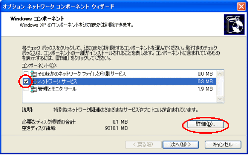 [ネットワークサービス]にチェックを入れ、[詳細]をクリックする |