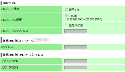 「ルータ設定」-「ルータ詳細設定」の[DMZホスト]と[仮想DMZ側 ネットワーク]と[仮想DMZ側 DNSサーバアドレス]を参照してください。 |