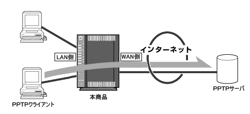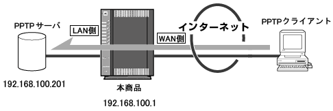 LAN側のPPTPサーバへWAN側のPPTPクライアントからアクセスする場合は、本商品へ静的IPマスカレードの設定が必要です。LAN側に設置するPPTPサーバを静的IPマスカレードで、WAN側からアクセス可能にします。