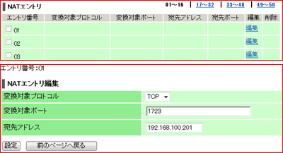 [NATエントリ]の中から編集したいエントリ番号行末の[編集]をクリックし、[NATエントリ編集]欄で下記のように設定する |