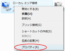 本商品が接続されているネットワークアダプタ名の[ローカルエリア接続]を右クリックし、[プロパティ]をクリックする |