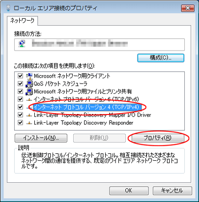 「インターネットプロトコルバージョン4(TCP/IPv4)」を選択し、[プロパティ]をクリックする |