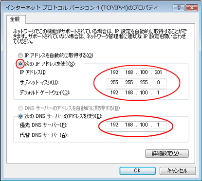 「次のDNS サーバーのアドレスを使う」を選択し、[優先DNSサーバー]に本商品のIPアドレス(工場出荷時は192.168.100.1)を入力する |