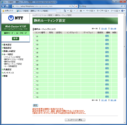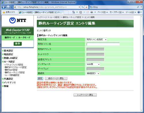 この場合は、「静的ルーティング設定」で設定した接続先で