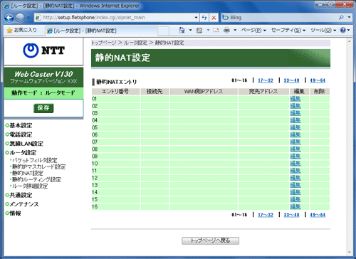 画面の[01〜16][17〜32][33〜48][49〜64]をクリックすると[静的NATエントリ]の[01〜16][17〜32][33〜48][49〜64]を切り替えて表示します。 |