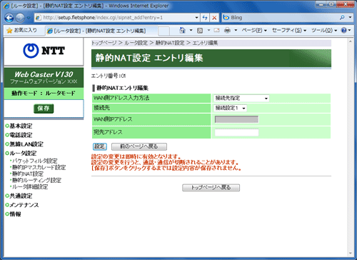 固定的に割り当てるWAN側IPアドレスと宛先アドレスの組み合わせを エントリ番号に登録する |