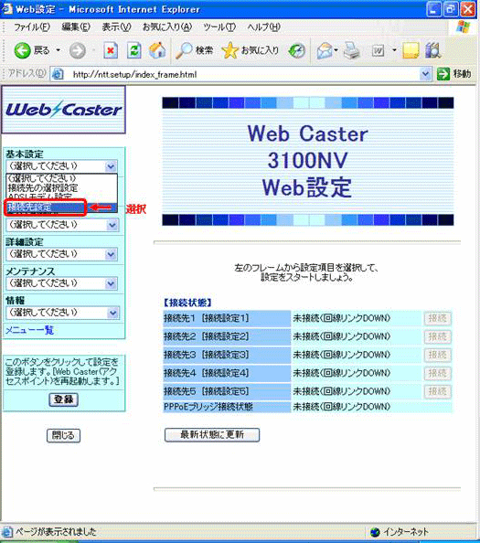 - メニューの「基本設定」から、「接続先の選択設定」を選択して下さい。