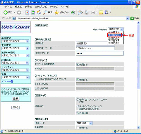 - 「編集する接続先」から、「接続設定2」を選択します。