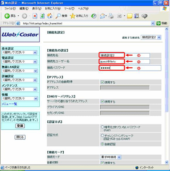 - 「接続設定2」にフレッツ・スクウェアの設定を行います。
