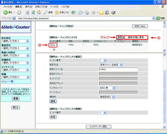 「静的ルーティングエントリ」に手順13で設定した内容が表示されます。