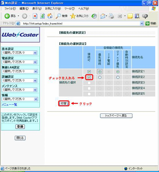 「切替」をクリックして下さい。- ※「接続設定1」の「接続可」の欄には、あらかじめチェックが入っています。
