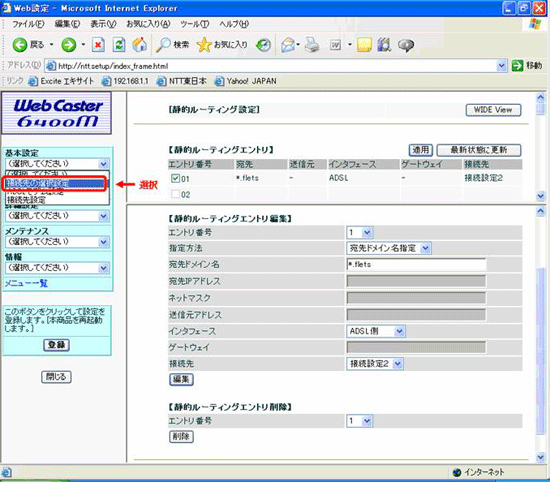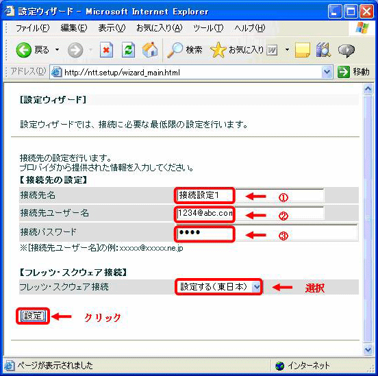 ここでは、接続設定1にプロバイダ接続、接続設定2にフレッツ・スクウェア接続の設定をする方法をご紹介します。