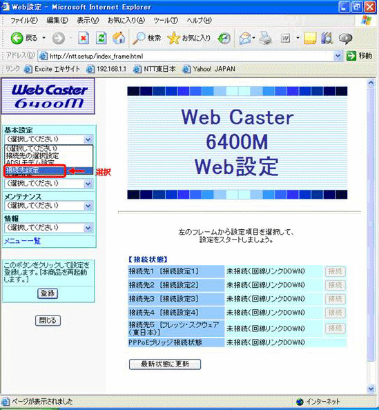 - メニューの「基本設定」から、「接続先の選択設定」を選択して下さい。